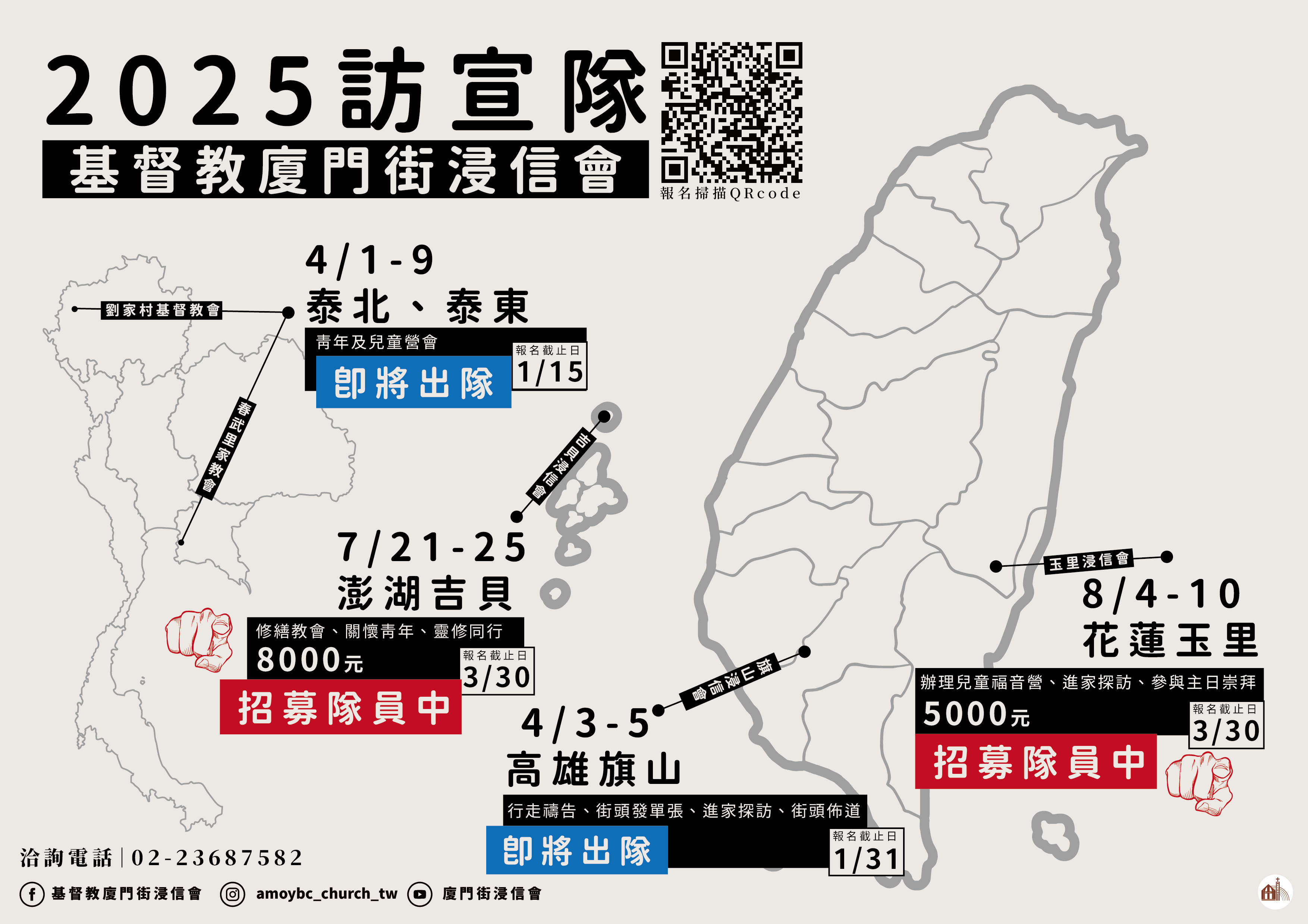 以上訪宣隊網路報名完成後,繳費及後續相關事項請洽教會幹事或傳道同工
