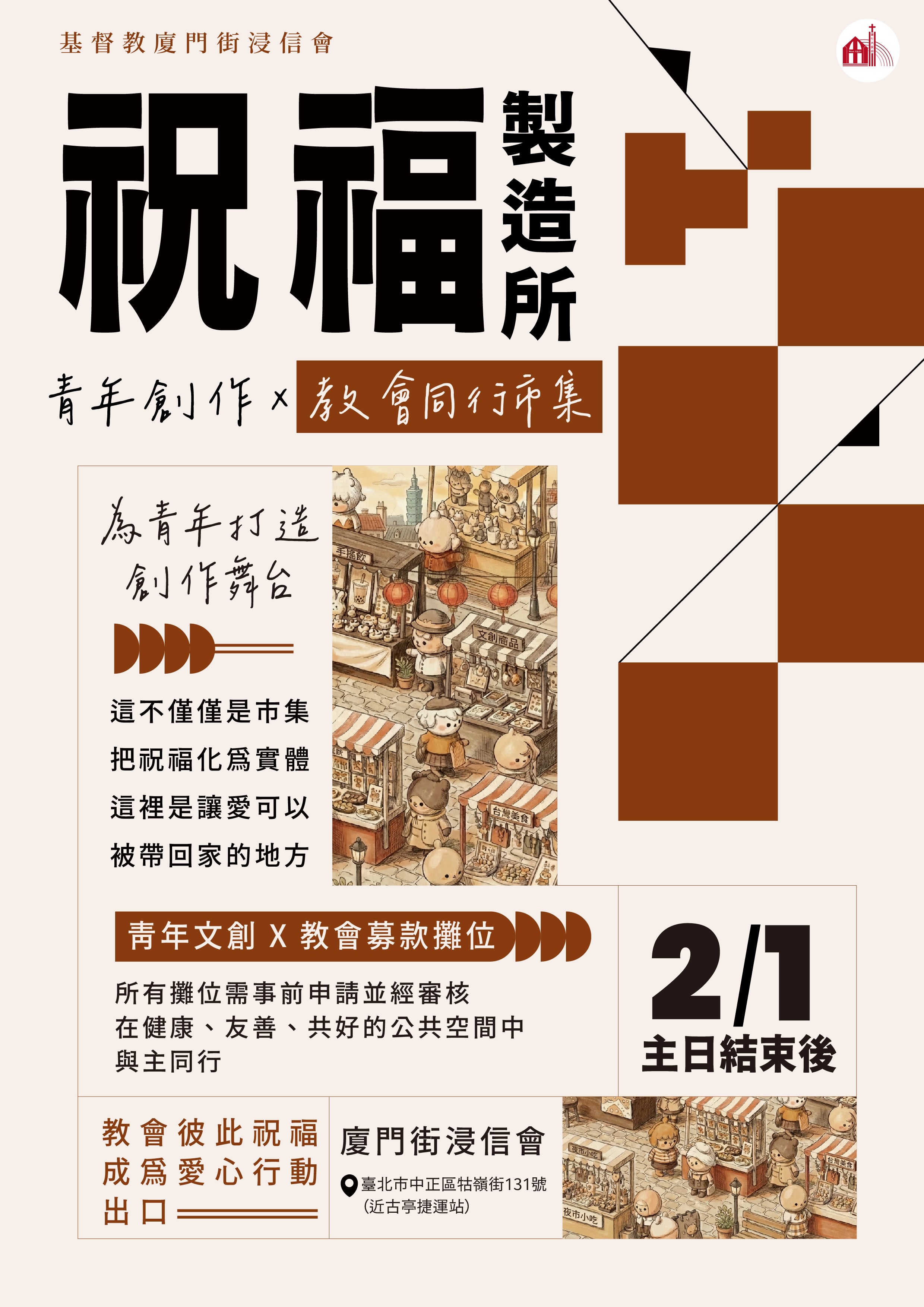 為青年打造創作舞台,讓教會彼此祝福,透過市集成為愛心行動的出口,我們期待在健康、友善、共好的公共空間,與主同行