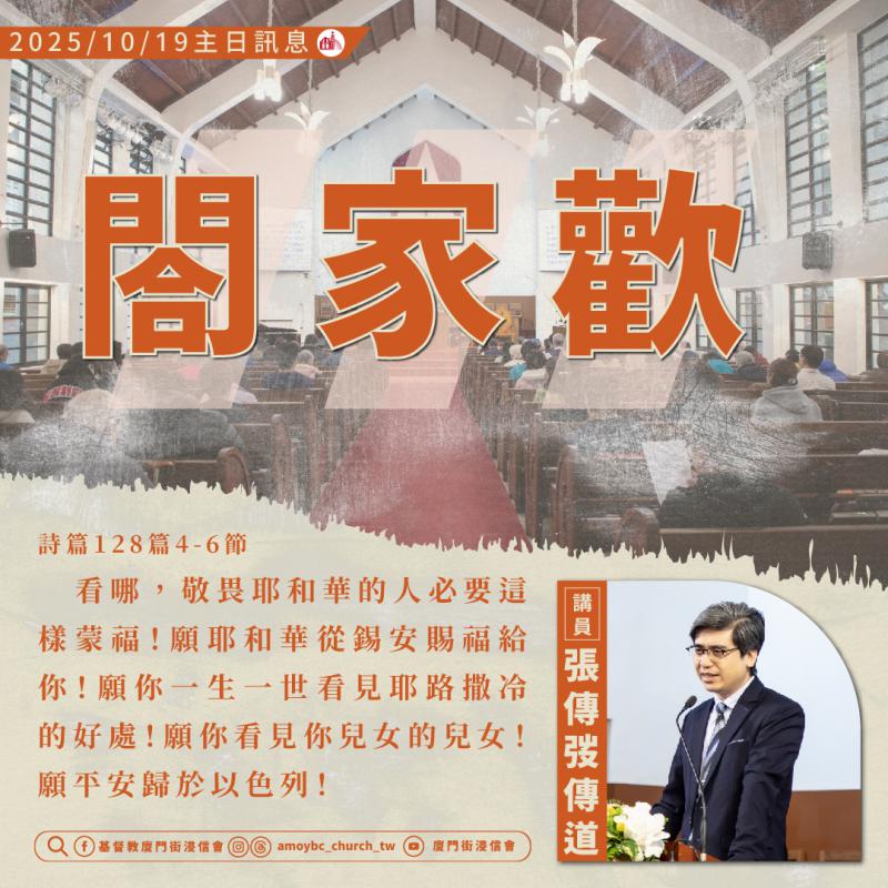 不過另一方面,我也明白對於一些人來說,面對家人是極具挑戰的事,甚至說是人生最難的課題也不為過。原本家庭應該是神所賜的福,但是你所經歷到的可能卻是真實的痛苦。甚至已經做了很多的努力,卻好像都徒勞無功。求主憐憫我們,回到神的面前我們就只有一個身分,是上帝所親愛的「兒女」。是因為神先愛了我們,先揀選了我們,我們才能夠敬畏耶和華,遵行祂的道。今天信息的內容絕對不是說,做基督徒的必須要家庭和樂、美滿…才叫做成功,而是提醒我們不要搞錯了應該追求的福分。羅馬書 8:15:「你們所受的不是奴僕的心,仍舊害怕,所受的乃是兒子的心,因此我們呼叫:阿爸!父!」如果一個小孩已經盡了他的力量,卻還是無法達到他要的目標,做父母的會怎麼對他呢?天父要邀請你回到祂的家,進入祂的愛當中,可以好好的休息、吃飯、睡覺。阿爸天父要以祂的恩慈憐憫,接納最真實的你,祂也會等候你再次恢復力量與勇氣,或許可以再去試試看。但卻不要忘記,你在天上有一個更真實永恆的家。無論我們在這地上是否能享受家庭之福,最終都要回到那天上的家。