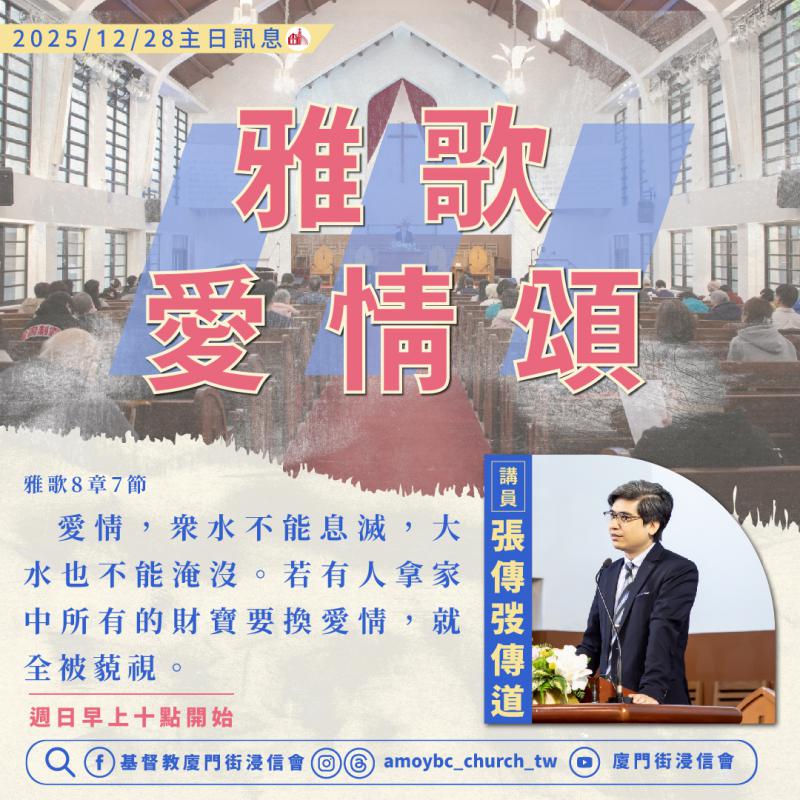 親愛的弟兄姊妹,今天的信息要問我們兩個問題。一、你愛不愛你的神?愛,是怎麼樣個愛法?只是服事神而已嗎?只是瞭解聖經而已嗎?只是按時奉獻而已嗎?所謂的愛是彼此深深地吸引,眼中就只有對方。如鹿切慕溪水,沒有水是會死的,你如果沒有神會死嗎?你要和神有私下的關係,只有你們兩個知道的記號,單單屬於你,你也屬於上帝。其實十字架就是最深刻-那愛的記號,主耶穌愛我們到甚至背負我們的罪,為我們犧牲了性命。那我們對神的愛還能有所保留嗎?第二、你願不願意為了所愛的神,站在眾人的面前,做見證、傳福音?當然會不習慣,當然會不舒服。俗話都說嫁雞隨雞、嫁狗隨狗,那麼嫁主當然就要「隨主」了。可是我們卻不用擔心這份使命帶來的重量,愛我們的神會預備一張旗幟,叫做「愛」,豎立在教會的頭上飄揚,使我們只要一抬頭就看見,就想起主的愛情比一切美酒更美。祂必定與我們同行,從亙古直到世界的末了。